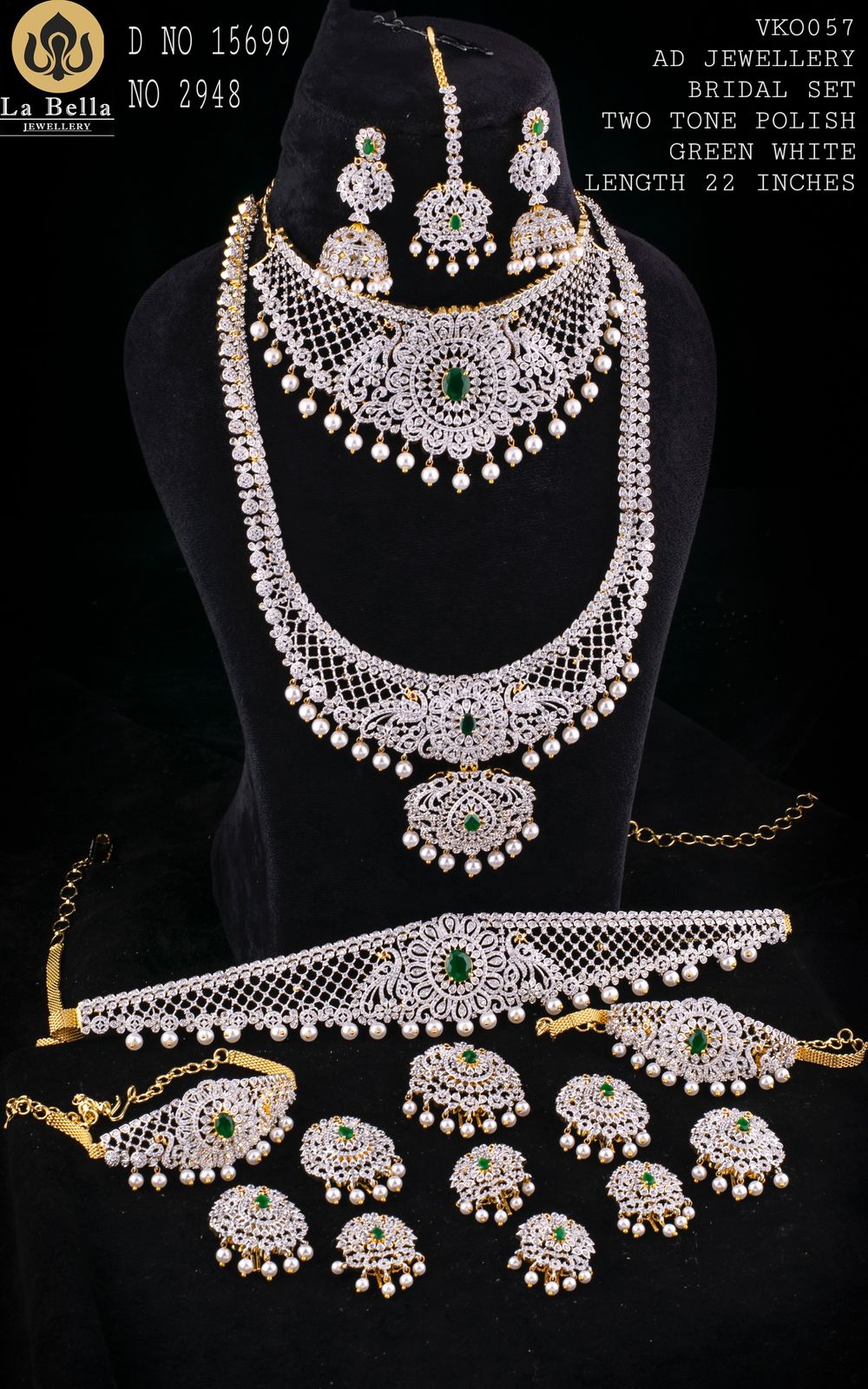 This jewelry is a set of Long Haram, Necklace, Hip Chain, Baajubandh,Hair accesories and Jhumka shaped Earrings.