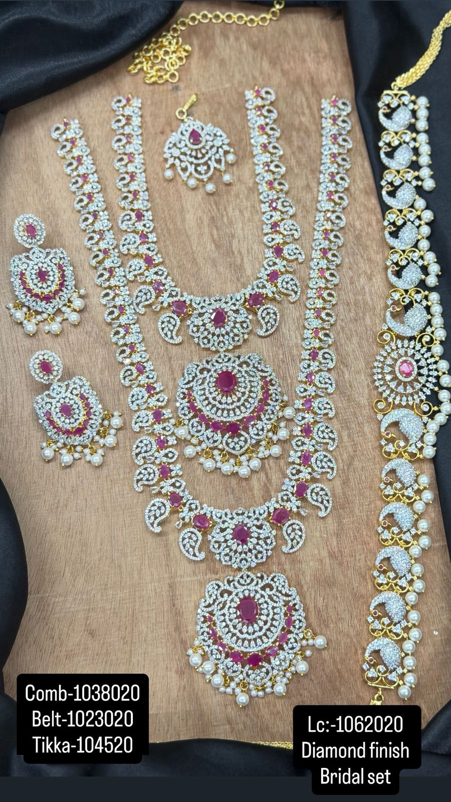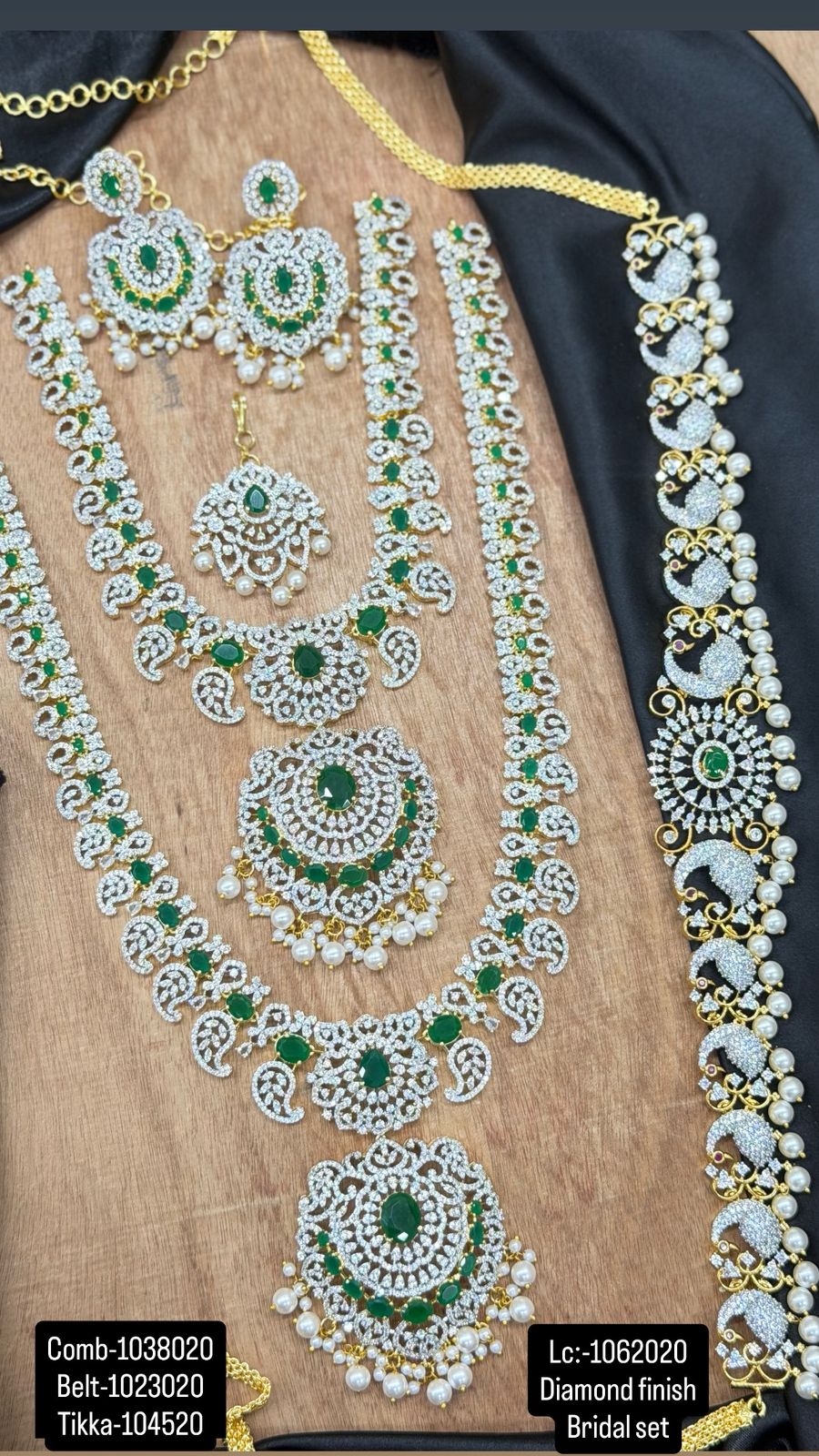 Contents: 1 Long Haram, 1 Necklace, 1 Vaddanam, 1 Mang tika, 1 Earrings.