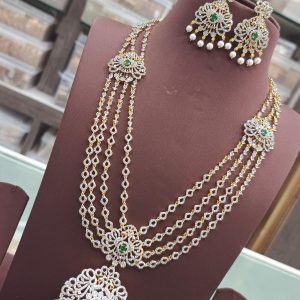 Gold-pleated CZ Jewelry comes up with a set of Long Haram, Necklace, Choker, Hair accessories, Maang tikka, Hip chain, and a pair of earrings and has a secured closure at the end.