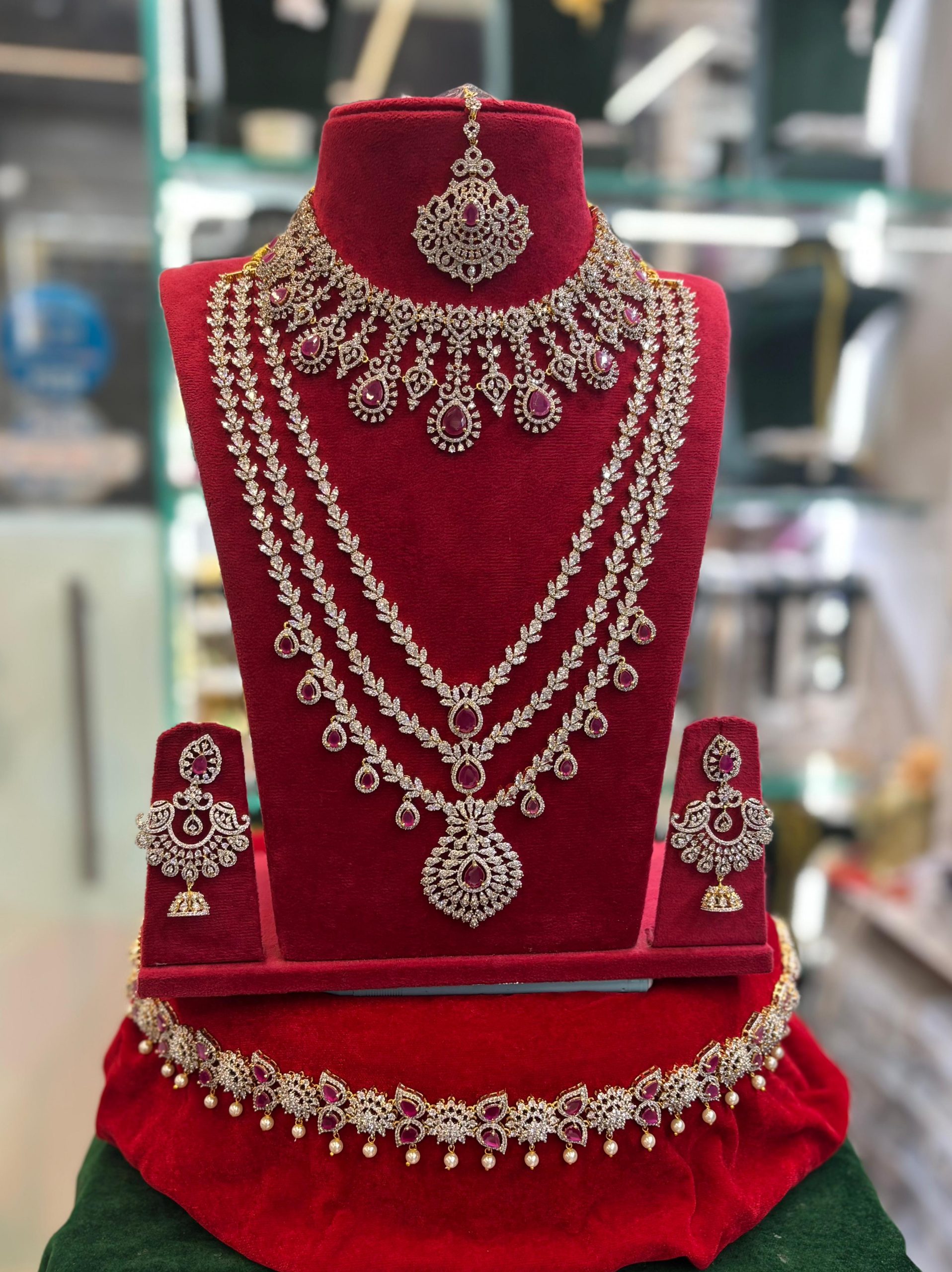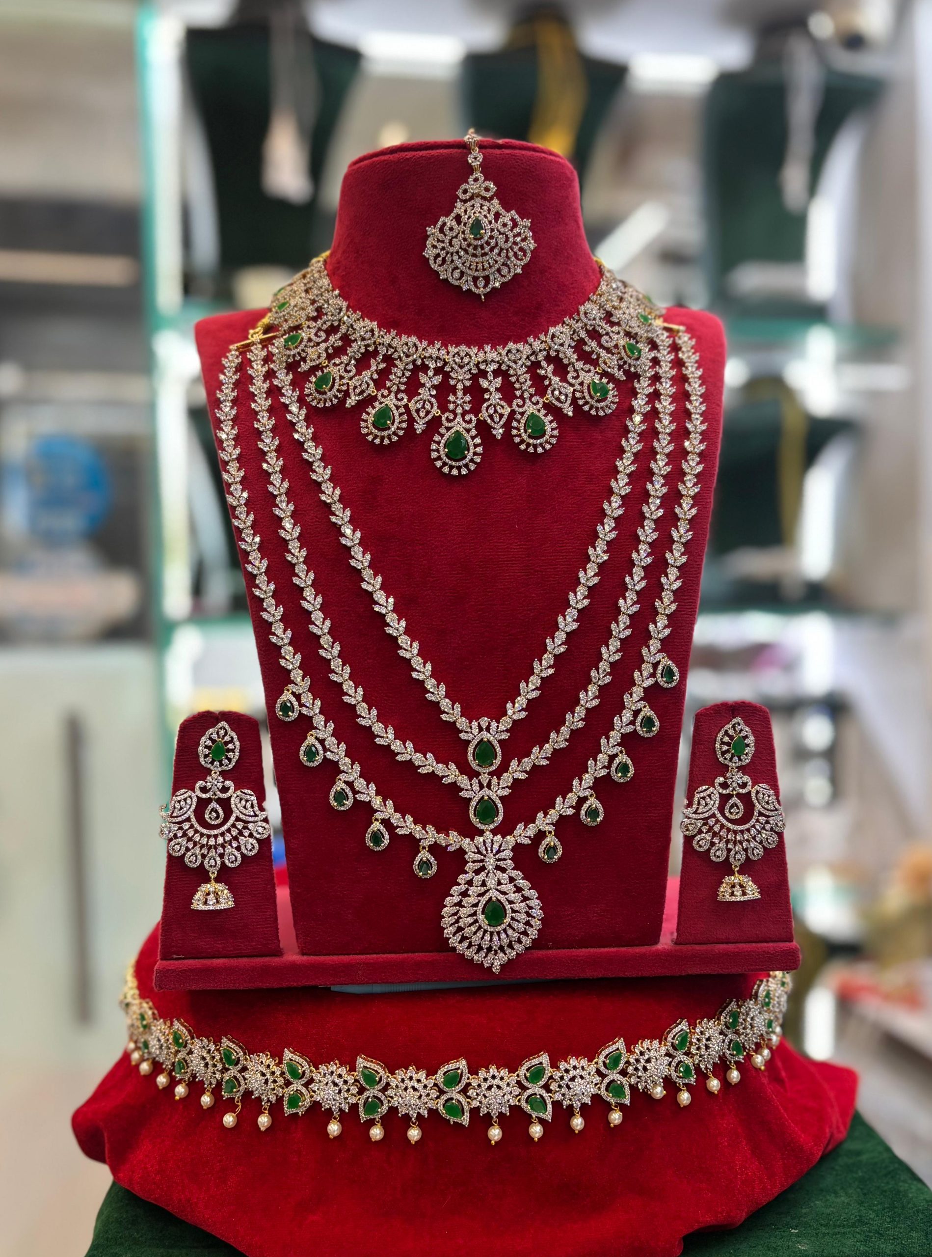 Gold-pleated CZ Jewellery comes up with a set of Simple Hip chain, Long Haram, Necklace, Maang Tikka and 2 pairs of dangled earrings and has a secured closure at the end.