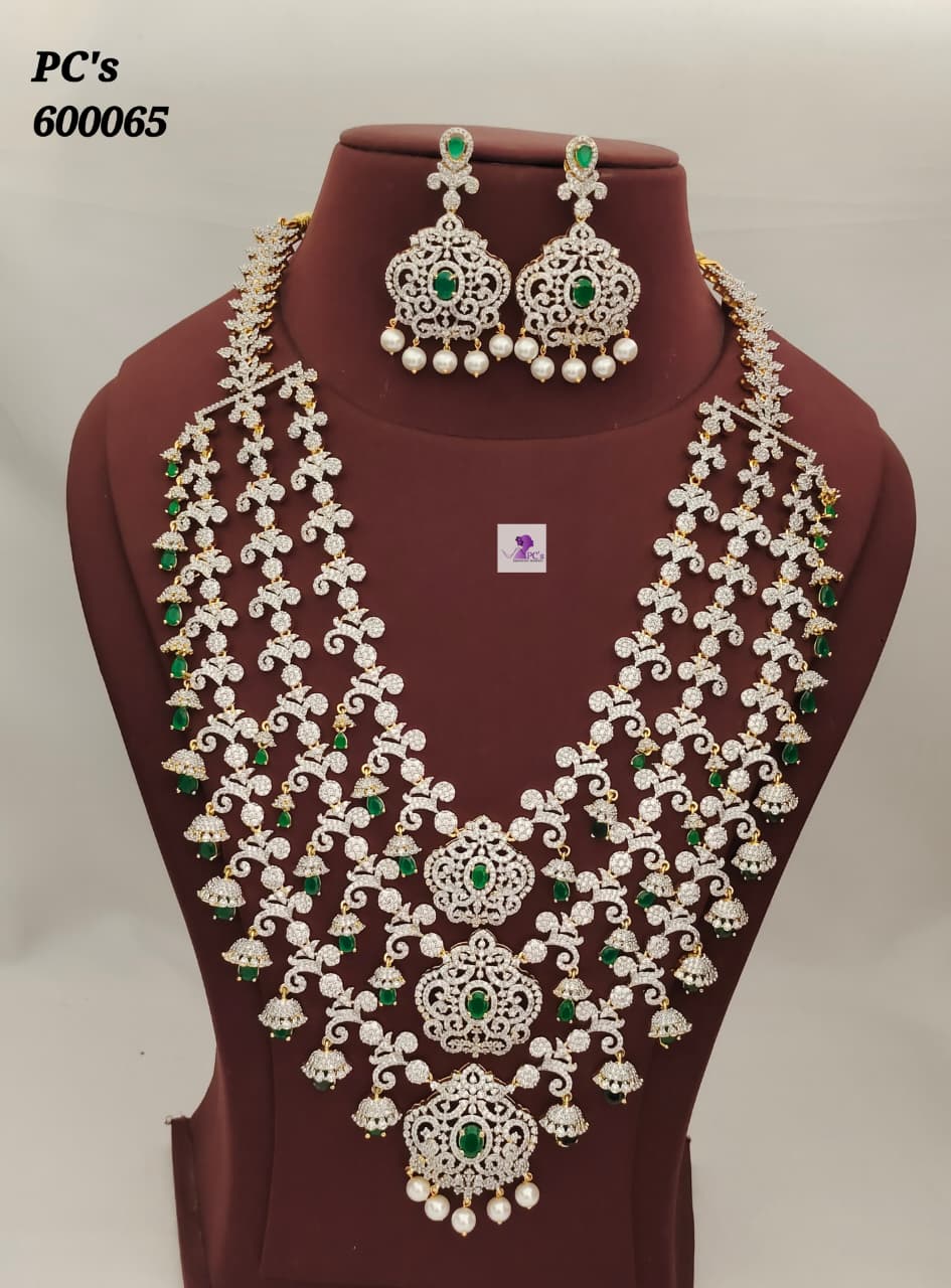 This is a complete gold-pleated CZ bridal set comes up with a layered Long Harm along with a pair of matching earrings.