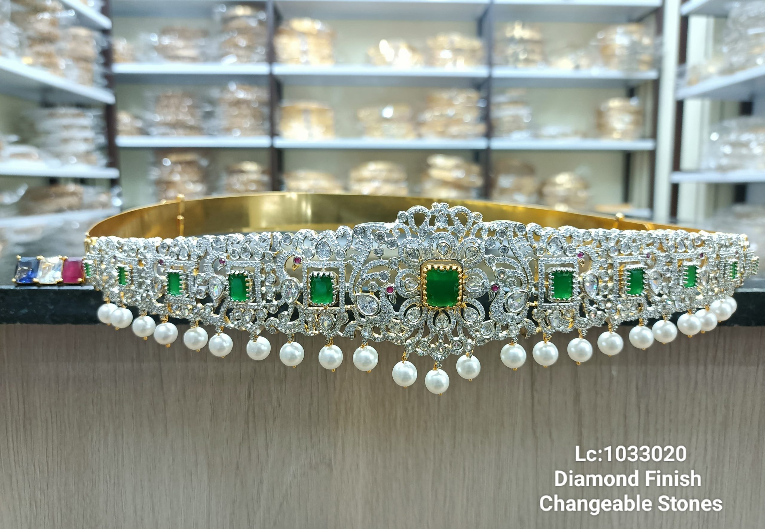 Graceful Pearl Drops dangle from the lower edge, adding a touch of classic sophistication. A standout feature is the Changeable Stones option, allowing you to customize the central and side coloured gems to perfectly complement your attire.
