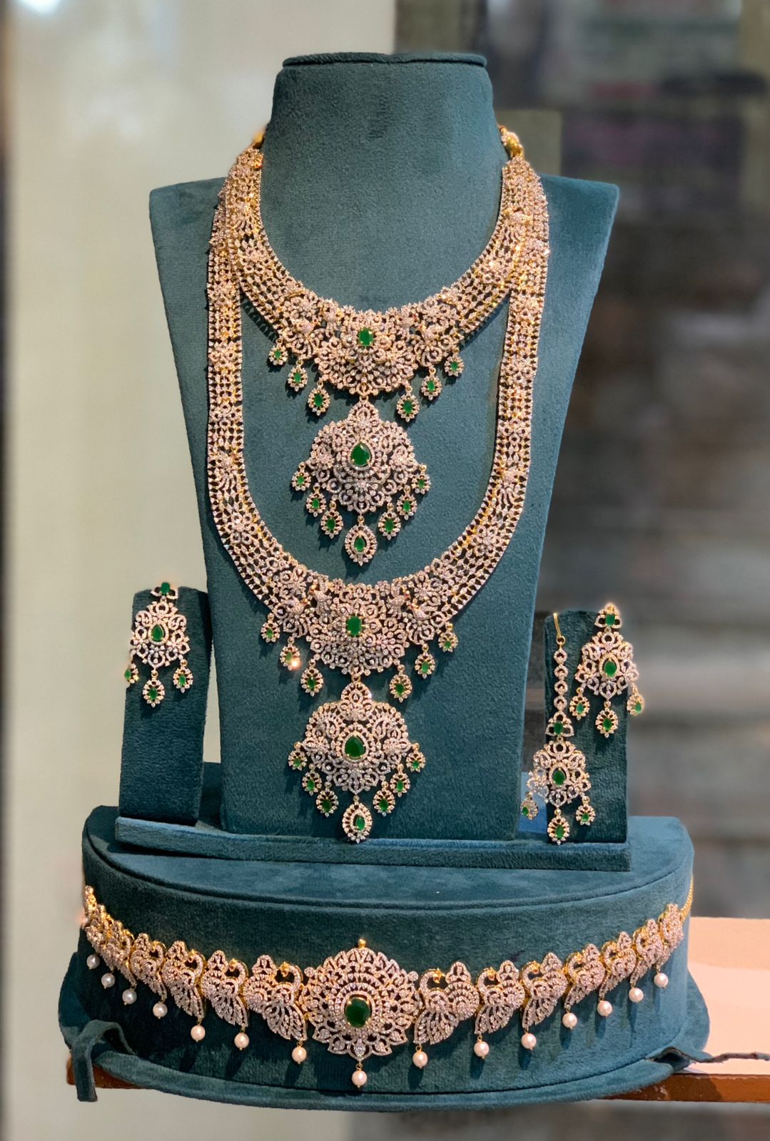 This gold-pleated Diamond style jewellery is a set of haram , Necklace , Hip chain , Mang tika and a pair of matching earrings.