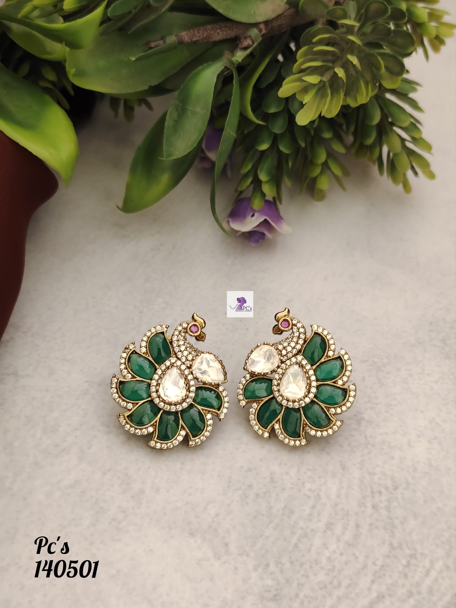 Red and green kundan stone earring in traditional peacock design jewelry studs.